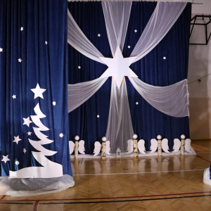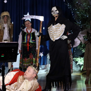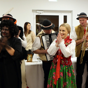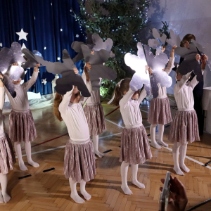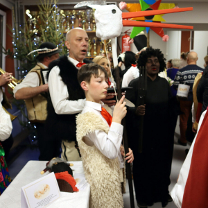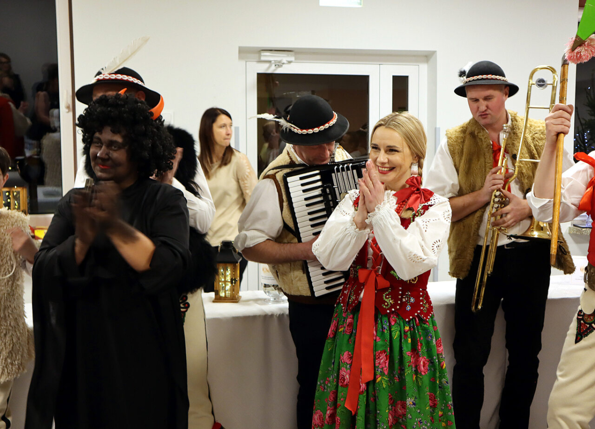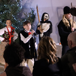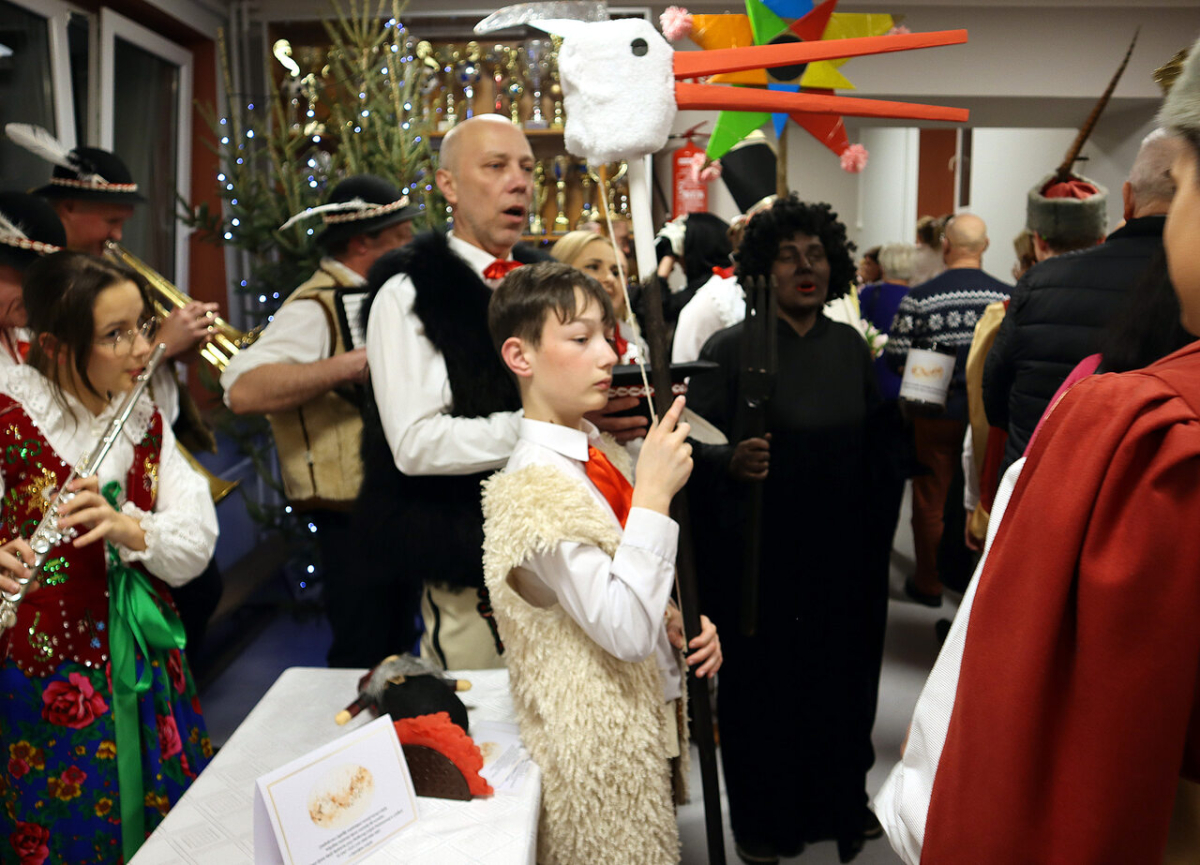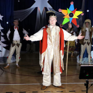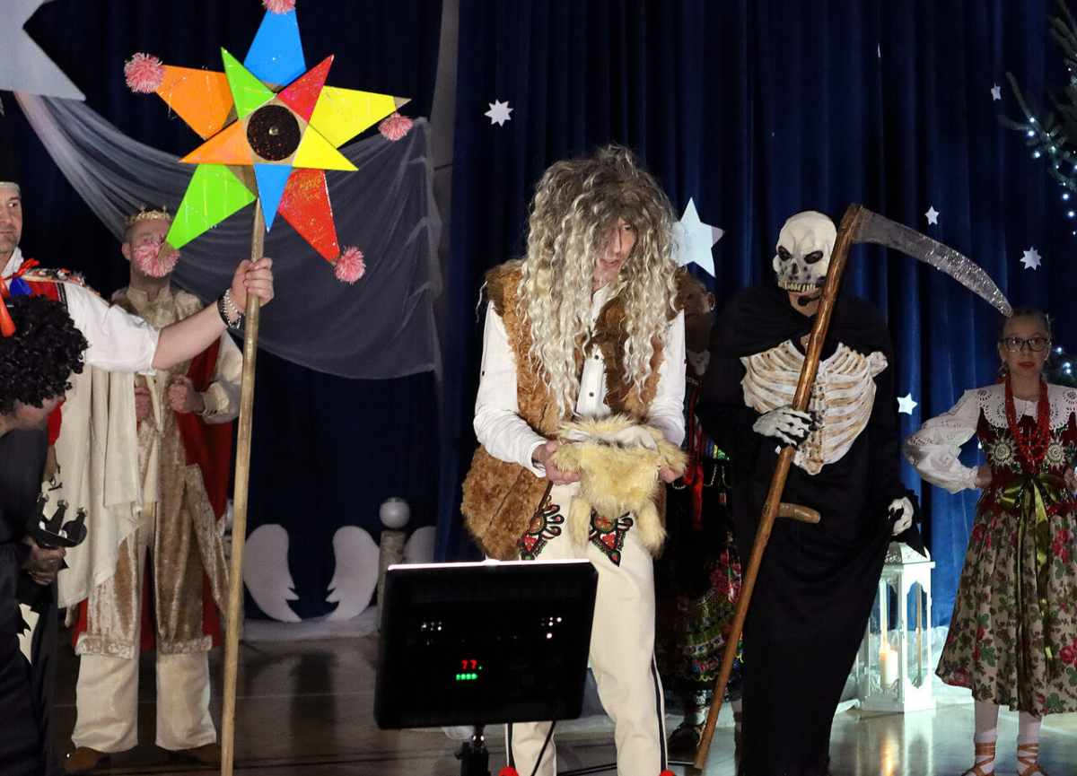 Noworoczne kolędowanie otworzył korowód kolędników z barwnymi postaciami, w które wspaniale wcielili się rodzice naszych uczniów. Prowadzony przy muzyce na żywo wprowadził publiczność w świat dawnych obrzędów, radości i noworocznych życzeń.