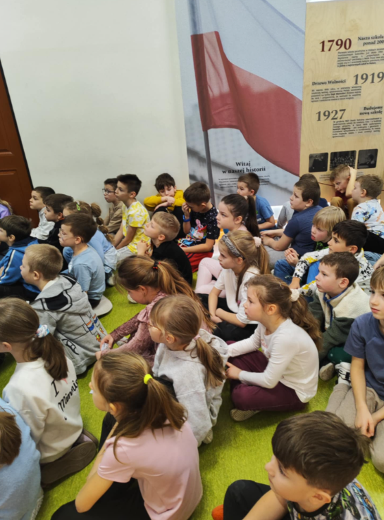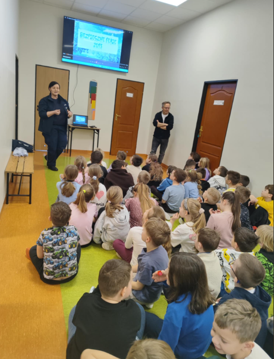 Następnie odbyło się spotkanie z policjantem, którego celem było omówienie zasad bezpieczeństwa w okresie zimowym oraz podczas ferii zimowych. Funkcjonariusz zwrócił szczególną uwagę na bezpieczne zachowanie w czasie zabaw na śniegu i lodzie, zasady poruszania się po drogach zimą, a także bezpieczeństwo podczas wyjazdów ,wypoczynku, kontaktu z osobami obcymi. Uczniowie aktywnie uczestniczyli w rozmowie, zadając pytania i dzieląc się swoimi doświadczeniami.